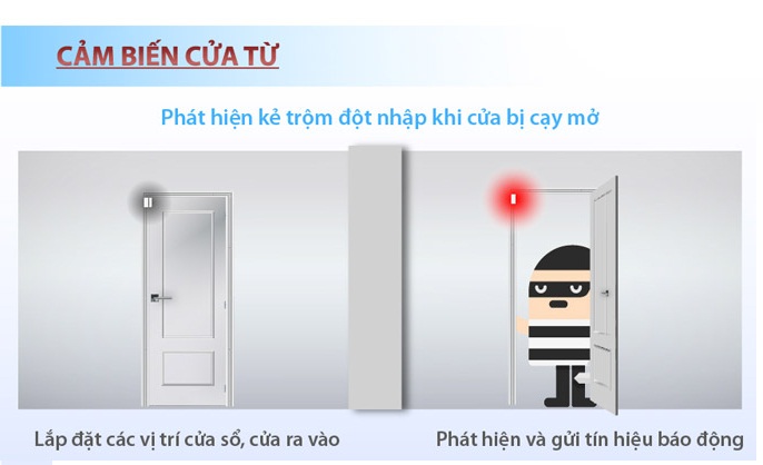 Cảm biến cửa: Là loại cảm biến cửa từ, được gắn ở hai bên cánh cửa chính hay cửa sổ. Khi có đột nhập mở cửa, cảm biến sẽ báo tín hiệu về bộ trung tâm