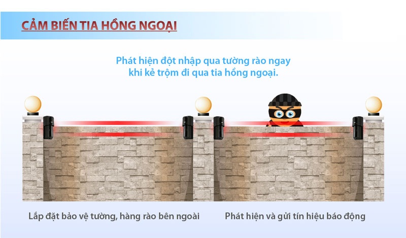Beam cảm biến hồng ngoại: Gốm 2 cảm biến thu và phát bằng tia hồng ngoại đặ cách t xa nhau từ 20m ~ 100 m. Khi có người leo qua, tia hồng ngoại bị cắt, cảm biến sẽ gởi tín hiệu về bộ trung tâm.