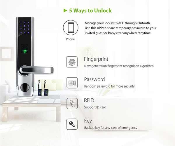 - Khóa cửa thông minh hỗ trợ: Vân tay / mật khẩu / thẻ / chìa khóa / Bluetooth.